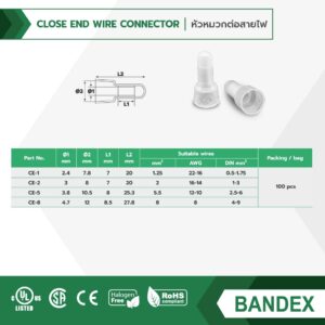 หัวหมวกต่อสายไฟ (Close End Wire Connectors) ของแบนเด็กซ์ ผลิตจาก Nylon 66 เป็นหัวหมวกต่อสายไฟแบบมาตรฐาน มีลักษณะเป็นหัวพลาสติกรูปหมวกทรงสูง มีความแข็งแรงทนทาน และยืดหยุ่นสูง มีท่อโลหะอยู่ภายใน สามารถใช้คีมย้ำหัวพลาสติกได้เลย โดยไม่ทำให้ฉนวนเสียหาย ตัวช่วยต่อสายไฟเข้าด้วยกันอย่างถูกต้องปลอดภัย เป็นวิธีการต่อสายไฟที่สะดวกรวดเร็วและต่อได้แน่นหนาที่สุด